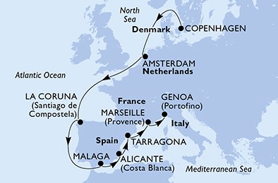 - Koppenhága -> tengeren -> Amsterdam Netherlands -> tengeren -> tengeren -> La Coruna (Santiago de Compostela) Spain -> tengeren -> Malaga (Granada) Spain -> Alicante Spain -> Tarragona Spain -> Marseille (Provence) France -> Genoa (Portofino) Italy